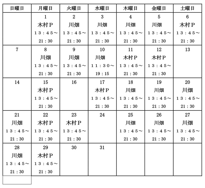プロショップ12月担当者表
